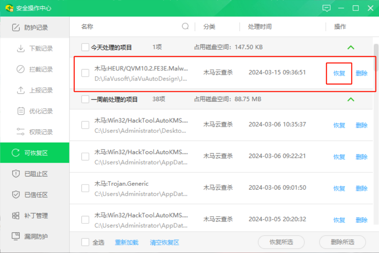 - 打开第三方杀毒软件,找到被删除的文件【JYGenKey.exe】。以360为例。