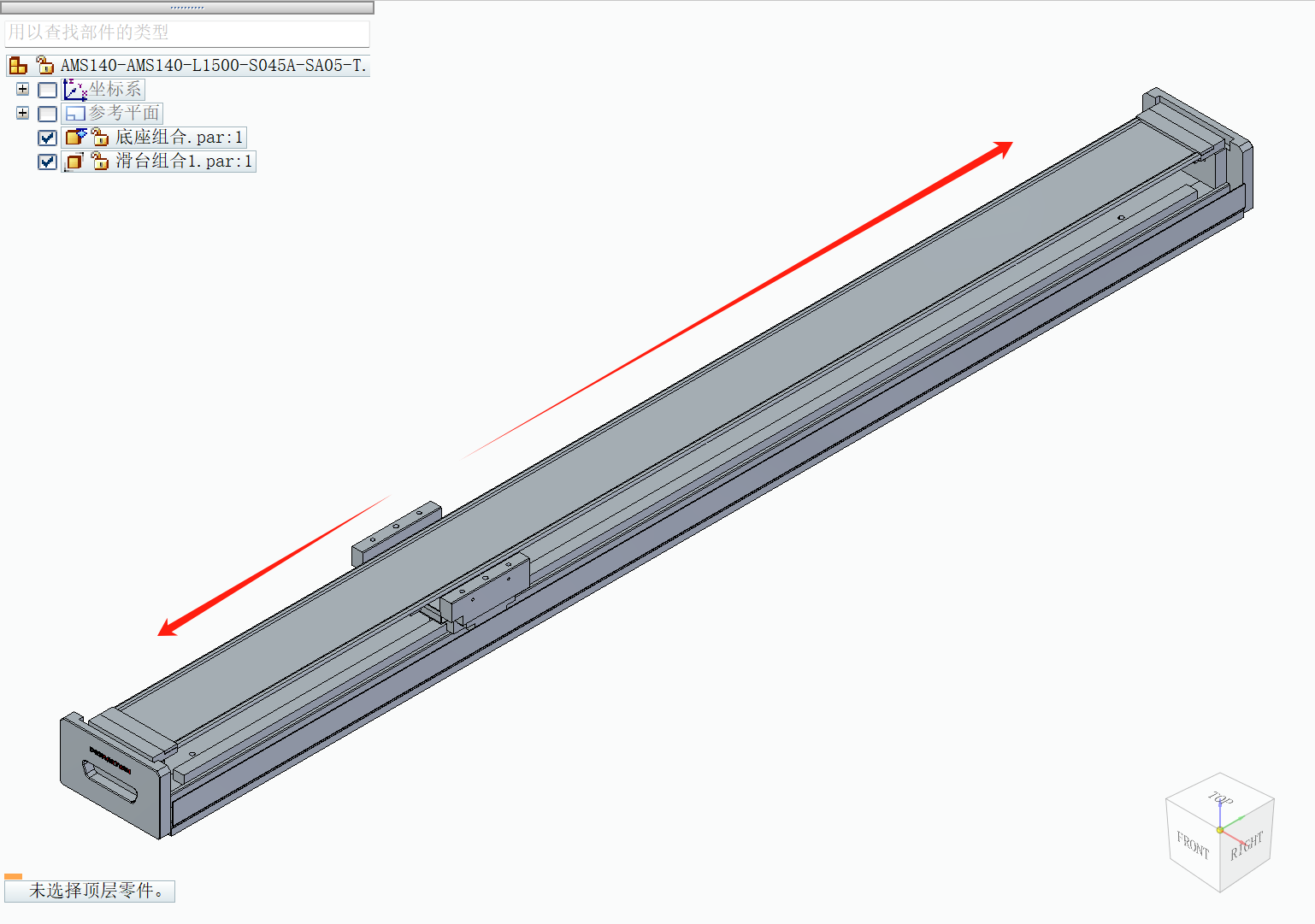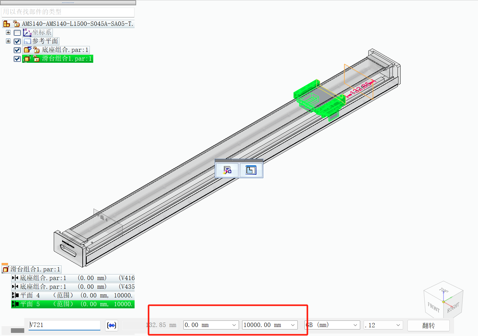 3,将滑台的左端面与起始位置平面,做范围配合。范围的最小值为0,也就是刚好起始位置;最大值给无穷大,当然这里没有办法设置无穷大,所以给一个尽量大的值,只要能大于这个系列最大行程的就可以。这样就控制滑台只能从起始点无限往右运动。