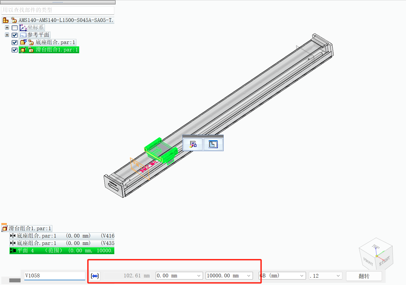 5,第3步和第4步范围叠加,就实现了滑台只能起始点到终点的运动。而且起始点平面和终点平面是可以用参数化来驱动距离,相当于控制了行程范围。