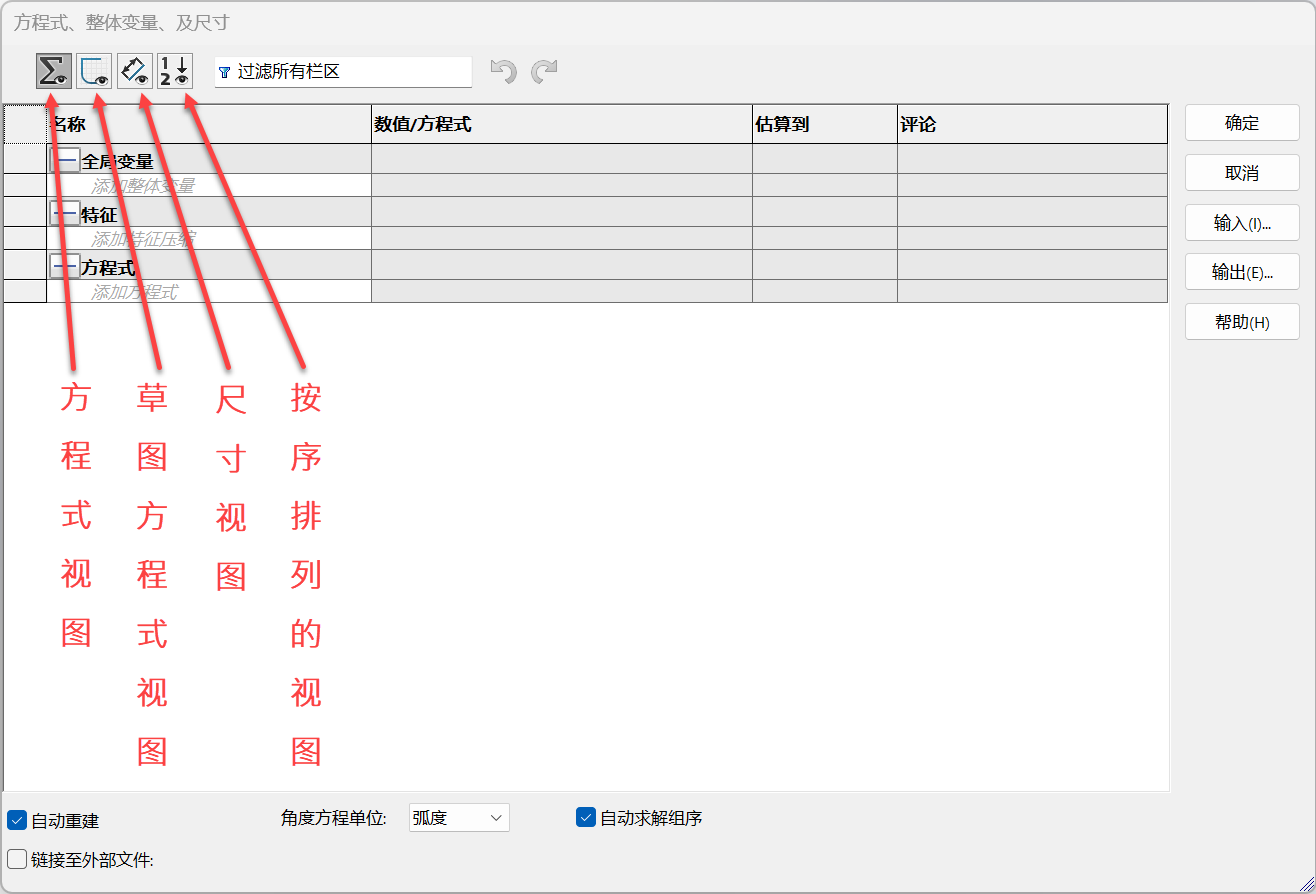 1. 四个图标分别代表【方程式视图】、【草图方程式视图】、【尺寸视图】及【按序排列的视图】。