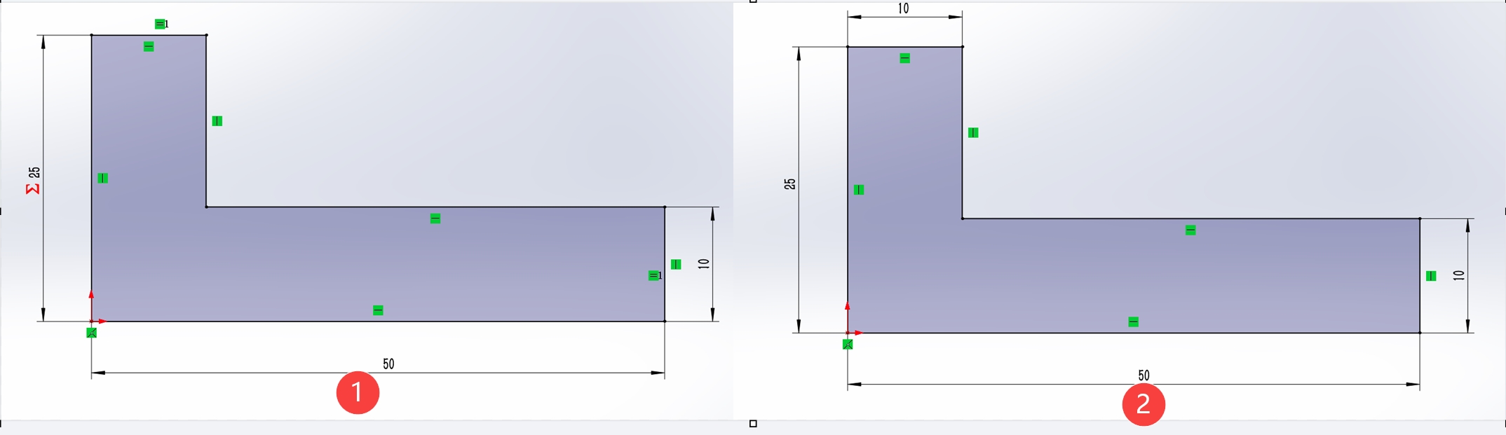 比如:L型产品,厚度一致,而且可变,宽度可变,高度为宽度的一半。推荐用图1来表达设计意图,厚度用相等约束,标一个尺寸,高度用公式=长度/2。