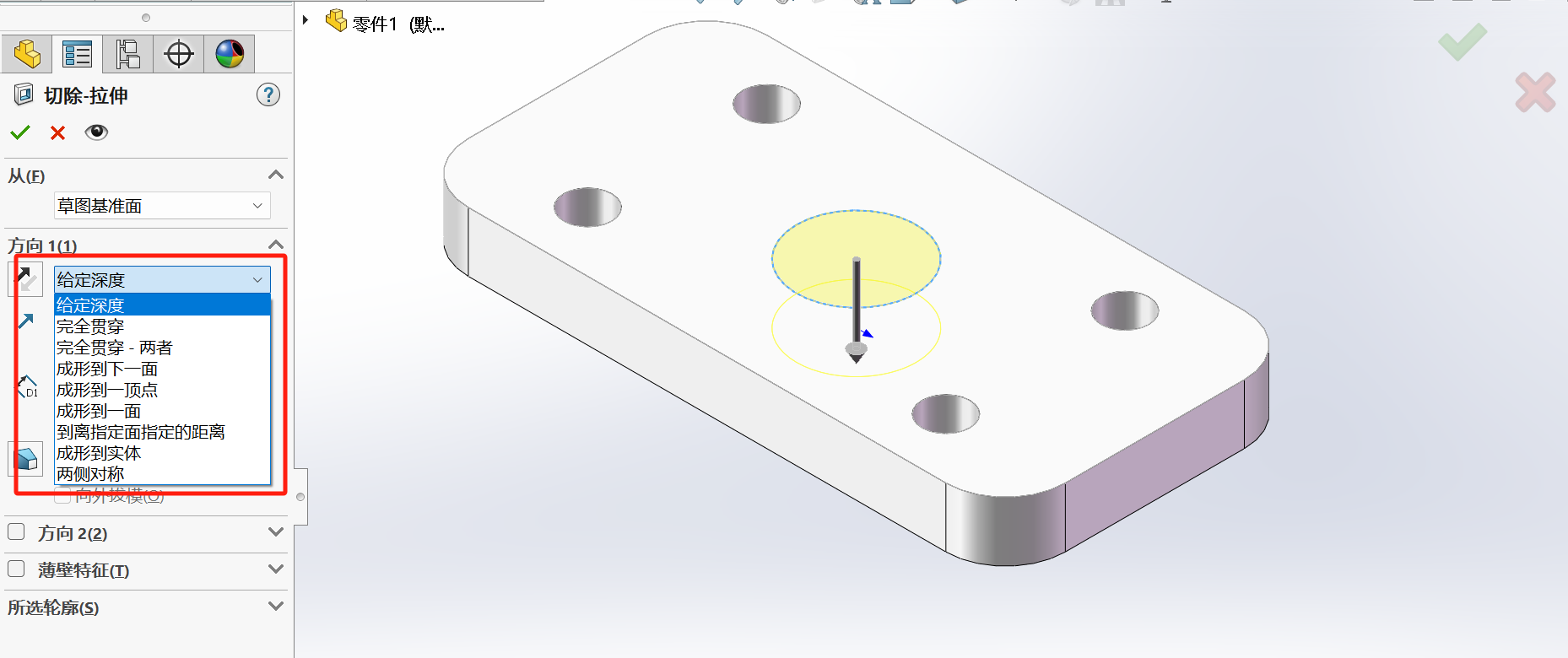 比如:下图产品中心孔要打穿,单设计这一个产品,你用“给定深度”或“完全贯穿”都能满足。但,如果是参数化设计一个系列化的产品,那就要根据设计意图选择合适的终止条件。这样不管厚度怎么变化,孔深度始终会跟随变化满足设计需求。