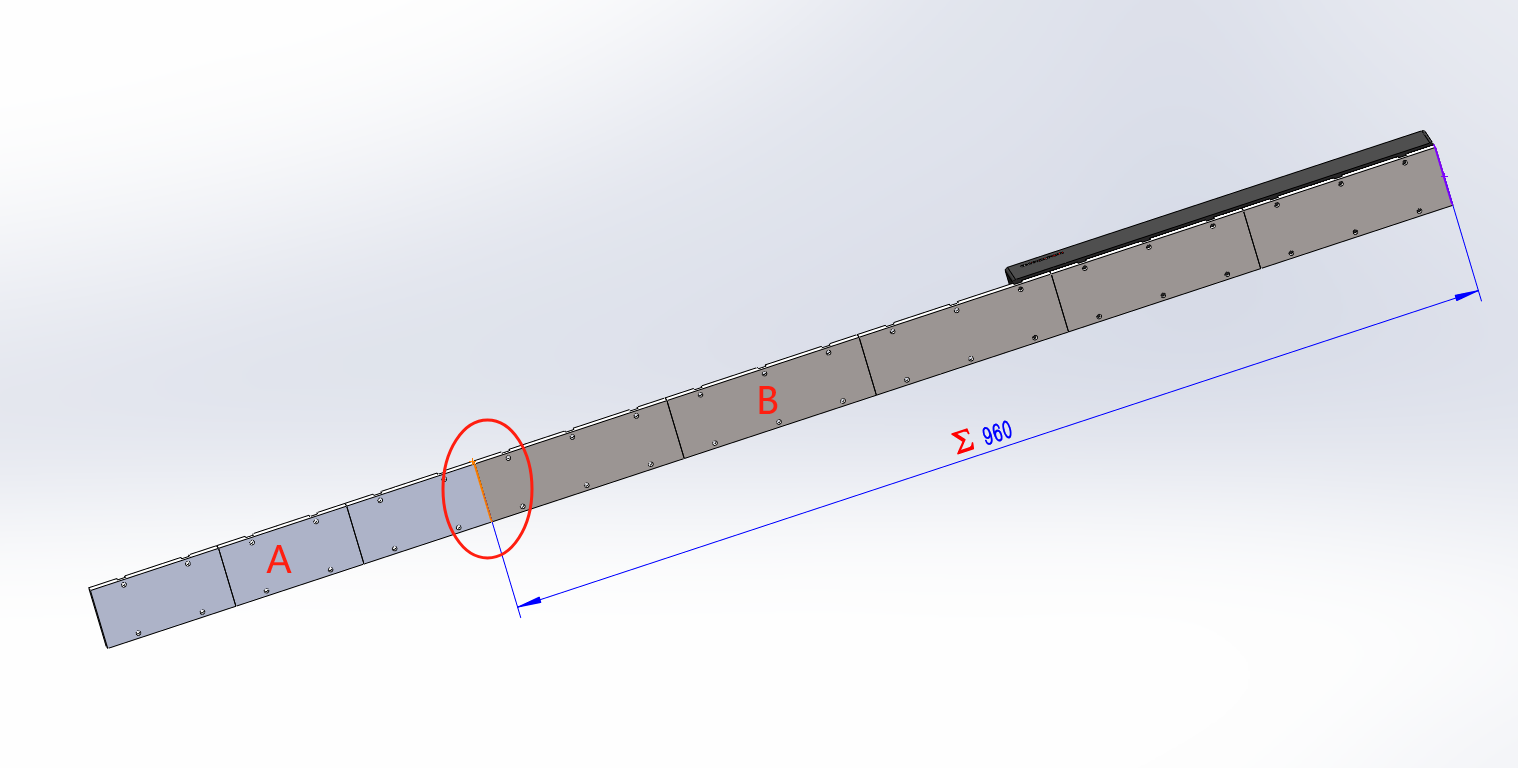 比如下图的直线电机,对于磁轨来说,有A,B两种磁轨可供任意选配组合,而且数量是可以任意指定。在做装配的时候,两种磁轨首尾相接的位置,就不能以首尾共面来配合,因为不知道A会和第几个B的末端面配合。为了满足设计意图,可以将A与最右侧端面用距离配合,距离的值=B的宽度*B的数量,用公式关系来表示。这样不管B的数量如何变化,A始终都是连在B的末端。